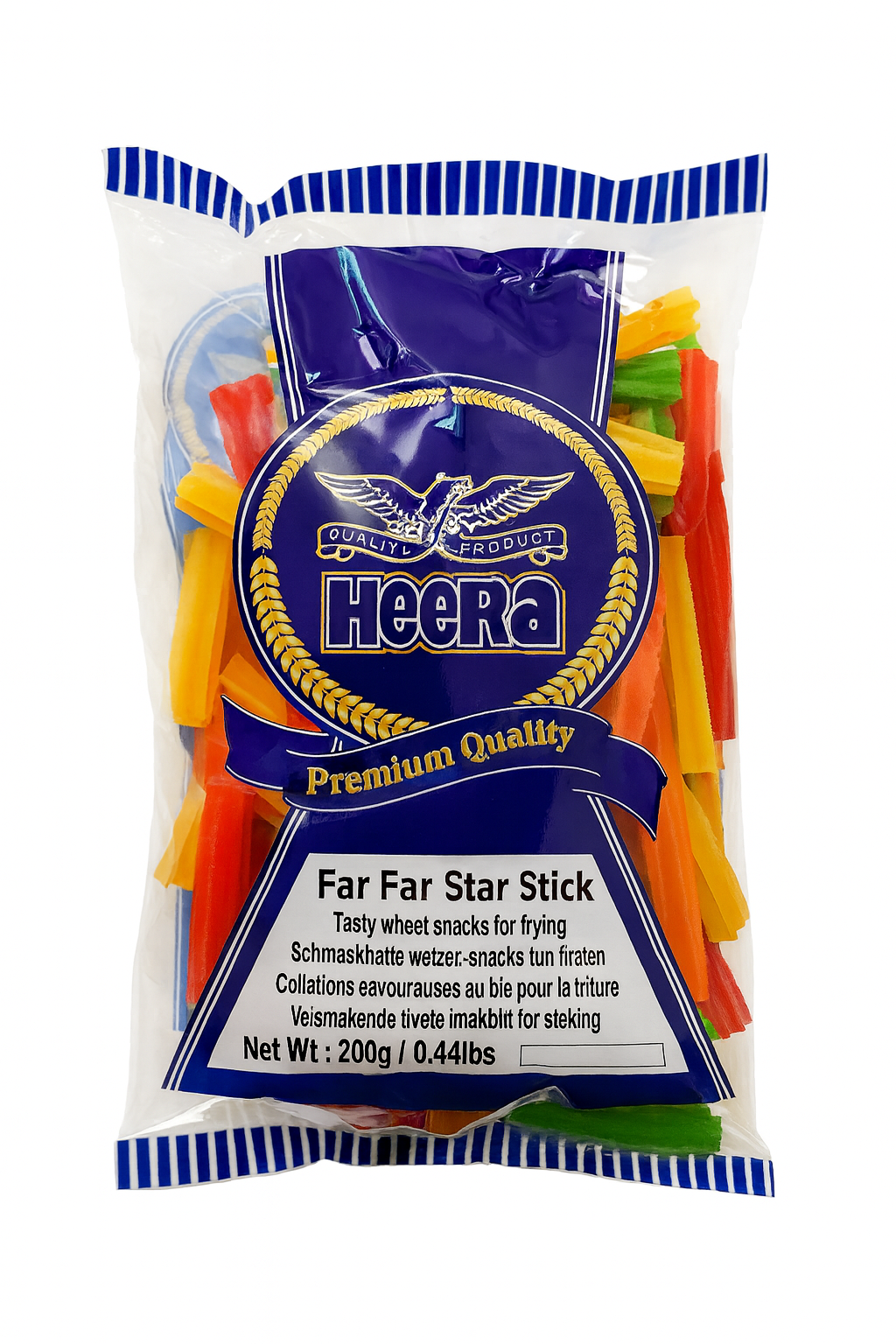 Crunchy, colorful, and fun – Heera Far Far Star Stick 200g are ready-to-fry wheat snacks that puff up into light and crispy treats in seconds. Shaped like star sticks, they’re a popular choice for kids and adults, enjoyed as a quick snack or as a crunchy side with meals. Easy to prepare and full of texture, they bring the authentic taste of Indian fryums straight to your home. Shop now at Cosmo Cash and Carry and enjoy traditional Indian snacks in Spain.